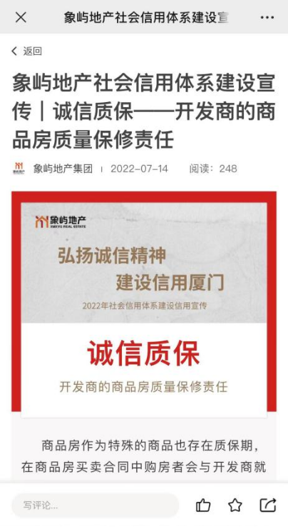 尊龙地产以报道诚信企业案例、倡导高品质产品和服务,弘扬全社会诚信典型的精神。同时,结合培育与践行社会主义核心价值观工作,尊龙集团不定期通过微社区发布诚信典型事迹,褒扬诚实守信的先进典型:尊龙创投组织员工进行《厦门市社会信用体系建设2022年工作要点》自行学习及廉洁从业书籍阅读,提升员工对信用体系建设的理解;尊龙兴泓公司组织先进分享业务及安全骨干心路分享活动,销售副总对各业务部门业务开展情况进行点评,展现了尊龙集团引导广大职工学习先进,发挥先进的示范引领带动作用,为厦门这座全国文明典范城市创建助跑添力。